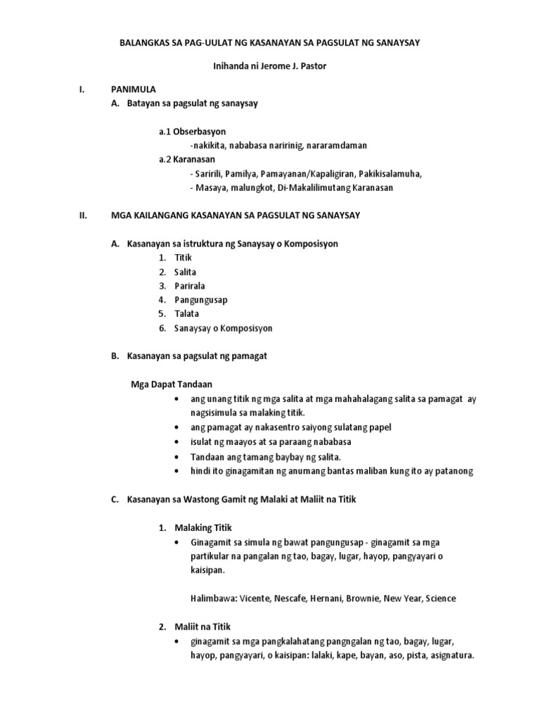 Balangkas Ng Ulat Sa Pagsulat Ng Sanaysay